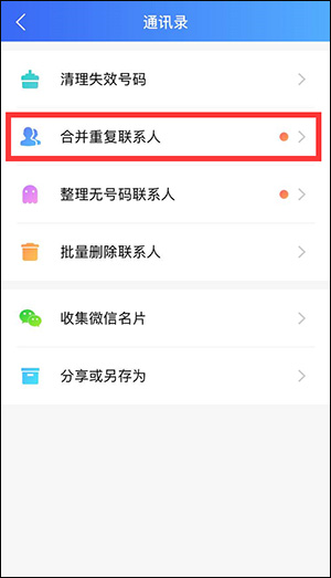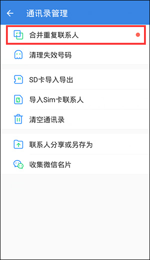 请前往右下角【我的】菜单,在其中找到【通讯录管理】选项,该选项里包含“合并重复联系人”功能。点击进入此功能后,依照相关指引进行操作便可。