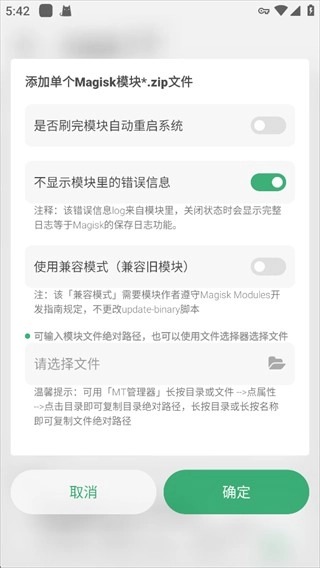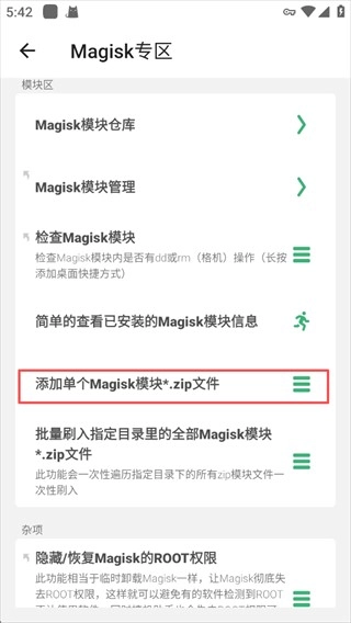 在【Magisk专区】中,您可以选择检查Magisk模块,或者对其进行管理,此外,您还可以通过添加单个Magisk模块*.zip文件来扩展系统功能。