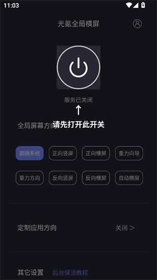 1. 打开光氪全局横屏模式,在界面中找到电源图标并点击,随后开启软件服务。
