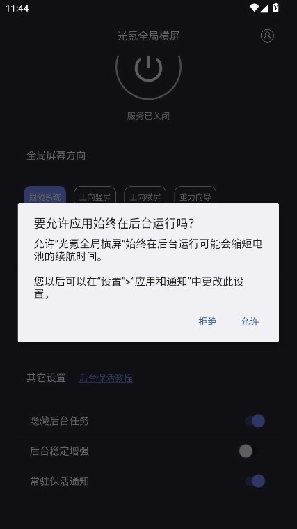 3、悬浮窗控制:通过悬浮窗一键开关服务状态,随时管理屏幕方向,操作便捷。